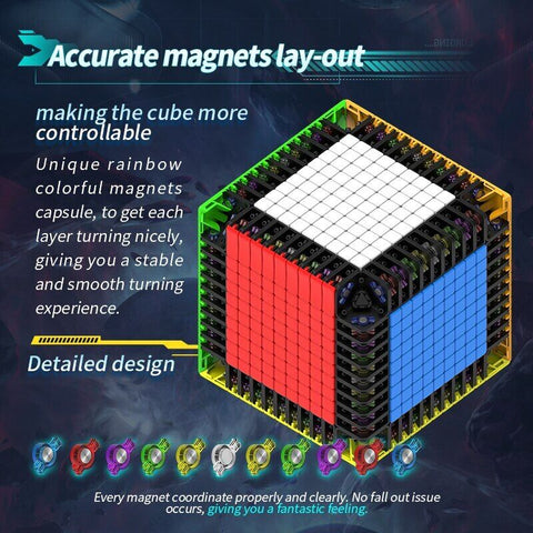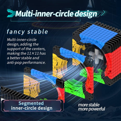 The DianSheng Galaxy 11x11 M is the world's first factory magnetized 11x11! It has incredibly smooth turning, a medium magnetic feel which is perfect for big cubes like this, and a concave outer layer that makes the grip more secure. This is a brilliant puzzle that will make any big cube fan challenged!