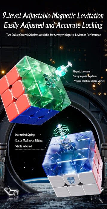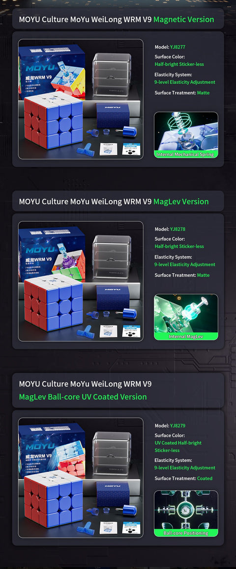 The 3x3 Moyu Weilong WRM V9 Magnetic (Standard Version) is Moyu's newest flagship 3x3. The Moyu Weilong WRM V9 has 3 version: Magnetic (Standard), Maglev, Ball Core (Maglev, Magnetic, UV).